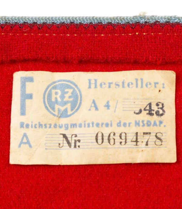 Ortsgruppenleiter Armband met RZM-tag - Een Orts-Level High Political Leader's Armband die ongeveer 128 mm x 520 mm meet. Deze armband van fijne kwaliteit is gemaakt van rode wol met gouden en blauwe koordversiering over de volledige lengte aan de boven- en onderkant aan beide kanten. Een rij geweven gele eikenbladeren, geflankeerd door twee dunne gele versieringen aan beide kanten, verschijnt in het midden van de armband en loopt over de volledige lengte. Het midden bestaat uit een geborduurde zwarte met gele versieringen swastika die op een witte katoenen schijf zit die in het geel is afgezet. In het midden van de swastika zit een zinken metalen pip met een politieke adelaar die op een swastika zit De achterkant van de armband is gemarkeerd met het originele RZM-papieren label nog steeds bevestigd en heeft enkele uitstekende heldere kleuren Uitstekende staat