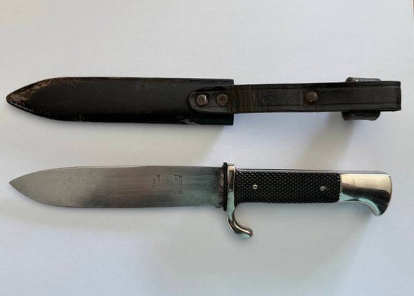 Zeldzame vroege HJ Fahrtenmesser magnetische (Hitlerjugend mes) uit de periode 1933-1935. De klinge draagt de devies "Blut und Ehre!". De klinge is gemarkeerd met de fabrikant: Hermann Konejung Solingen. Het heft is gemaakt van zwart bakeliet met een visgraatmotief en voorzien van het Hitler-Jugend-embleem De schede is van zwart gelakt staal met een leren draaglus. Een zeldzaam en historisch object